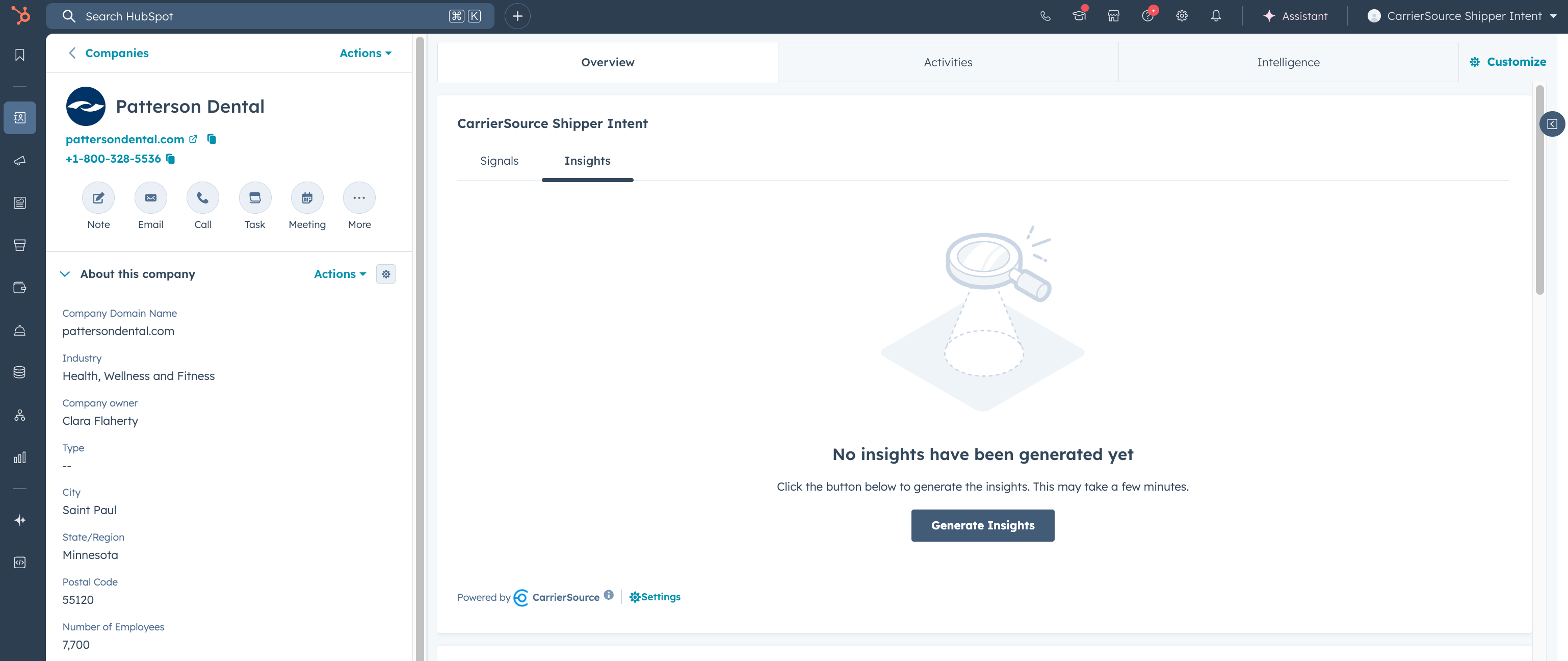 Once you’ve added the CarrierSource Shipper Intent card to your HubSpot company record view, you’ll be able to generate new insights and view previously generated ones. Navigate to any company record with a CarrierSource signal to see a synopsis of that company’s activity that matches the target feed you set up. Depending on where you’ve placed the CarrierSource Shipper Intent card (outlined above), this synopsis will appear on the "Signals" tab.