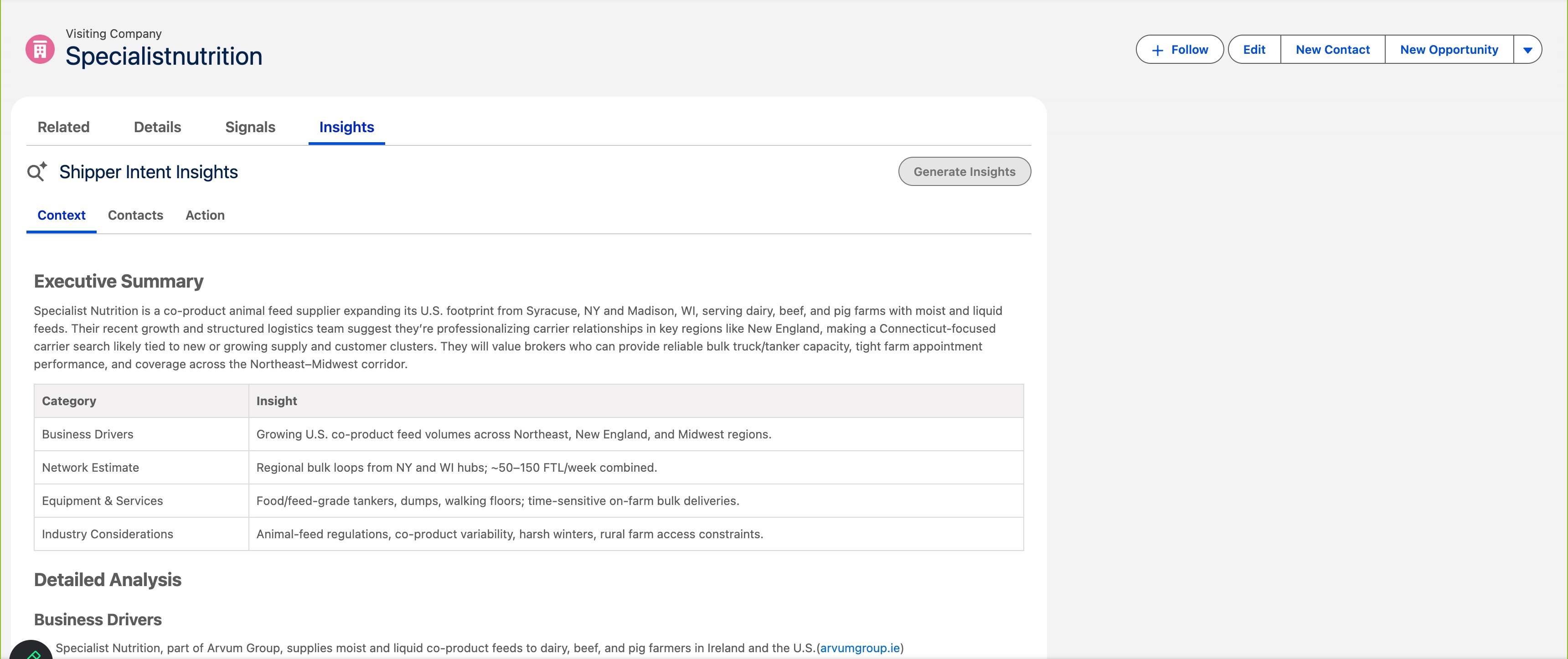 If your company has CarrierSource Research Agent Insights enabled, those will be synced into your Salesforce instance as well. You can view signals, generate insights, and view insights, all within Salesforce.