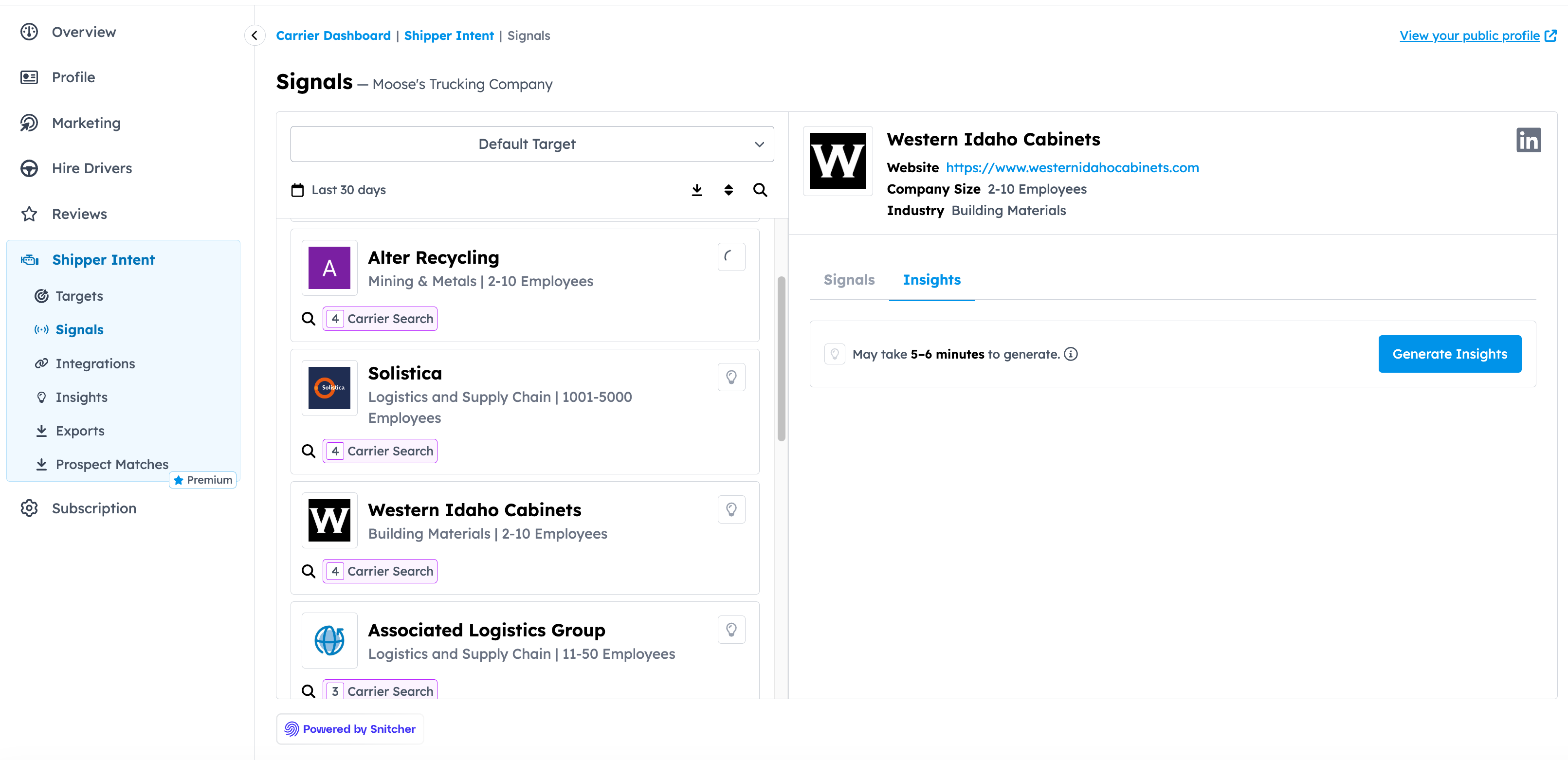 Click Generate Insights to run all three Research Agents on that shipper. Each insight generation uses one credit.